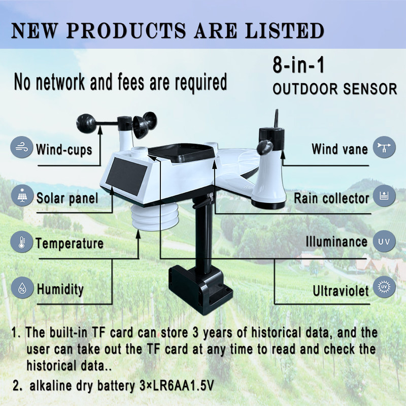 2이 기계의 감지 기능은: 온도, 습도, 바람의 속도, 바람의 방향, 강수량, 조명, 자외선.